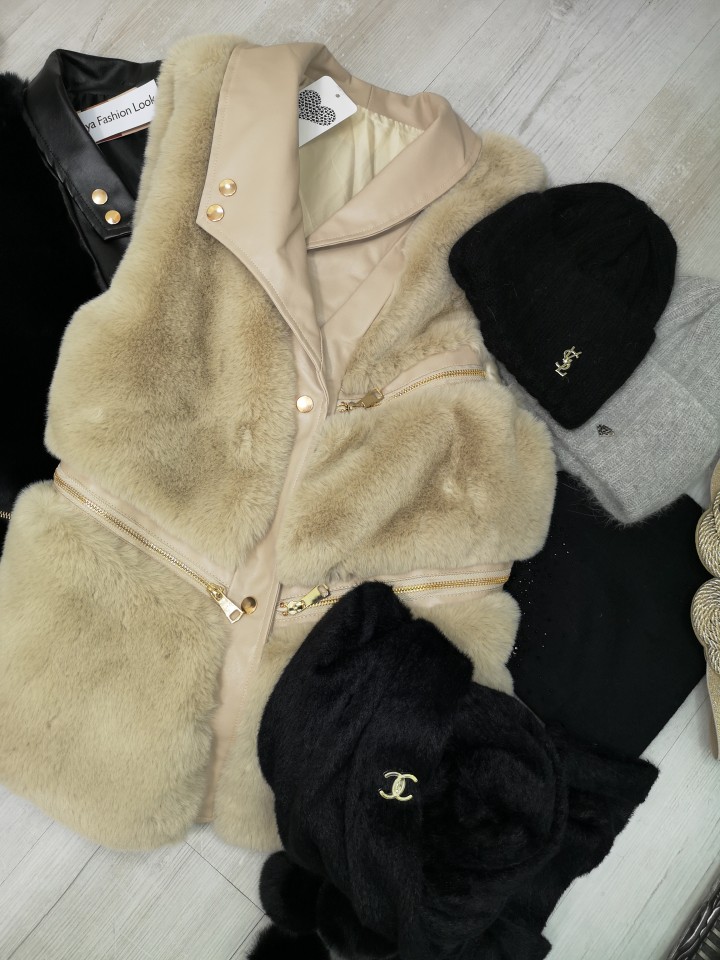 Kamizelka z imitacji futra ozdobiona złotymi suwakami. Świetna jako narzutka na sweter ,na koszulę ,na bluzkę.